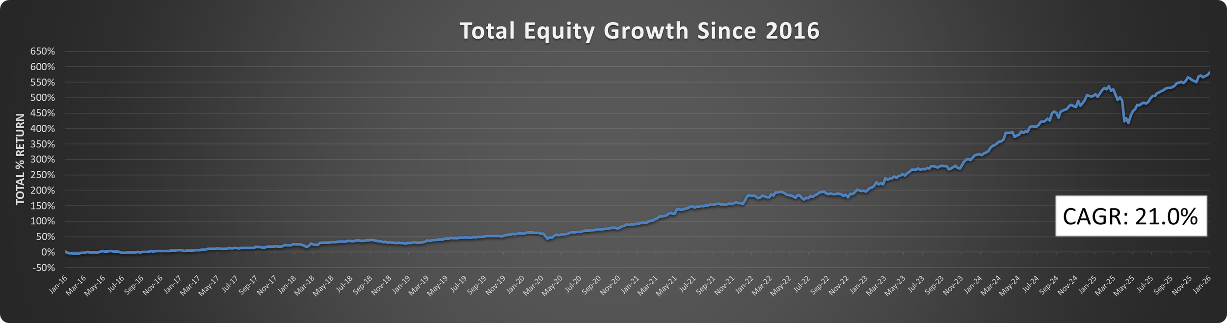 Below is my historical equity growth in terms of percentages since January 2016. This includes stock investments in registered and non registered accounts, cash balances, real estate equity balances, alternative investments, and other cash and non cash balances. Non registered and registered accounts are primarily invested both in the US and Canadian stock markets, with a focus on companies with a history of high ROE, high FCF multiples, consistent earnings growth, and low forward looking earnings multiples. I also deploy some small derivative position strategies and hedges that include short and long options, and option spreads, in both registered and non registered accounts.